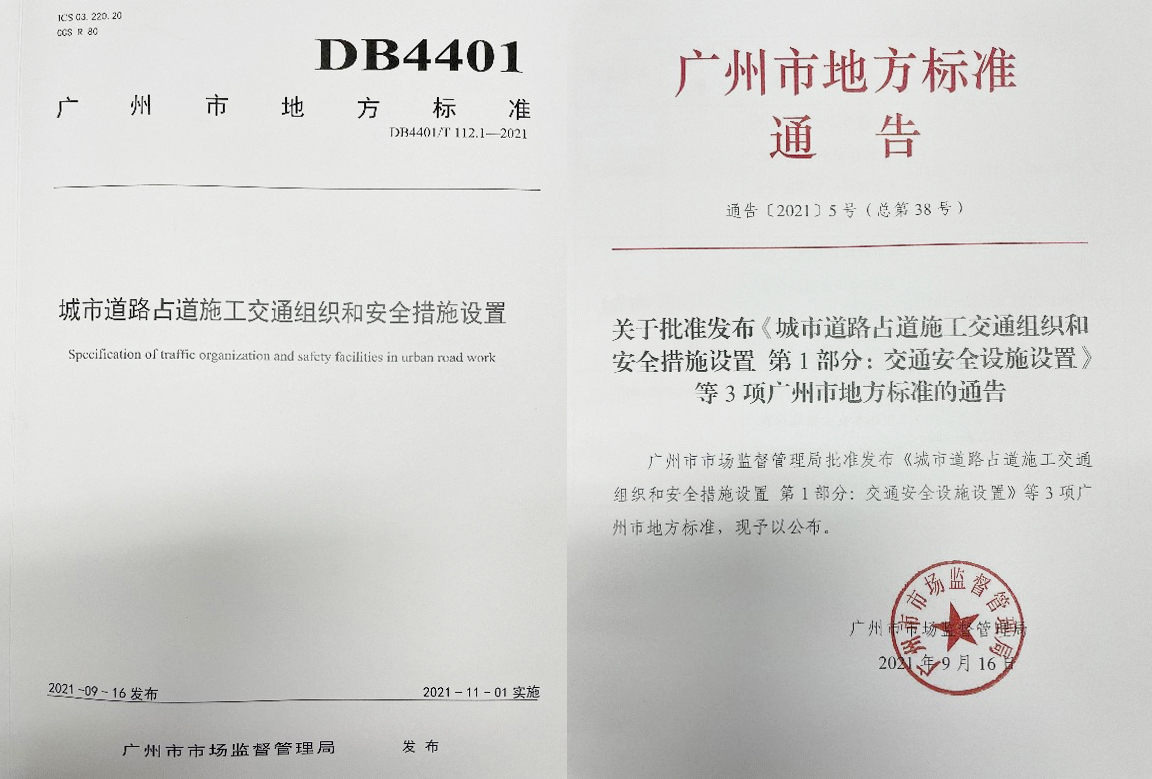 由广州市交通运输局牵头,我公司与市标准化研究院、市公安局交通警察支队联合编制的广州市地方标准《城市道路占道施工交通组织和安全措施设置》(DB4401/T 112—2021)于日前获广州市市场监督管理局批准,并自2021年11月1日起正式实施。