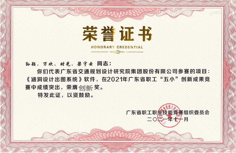 我公司数字化技术研究院研发的《涵洞设计出图系统》软件荣获2021年广东省职工“五小”创新成果竞赛创新奖