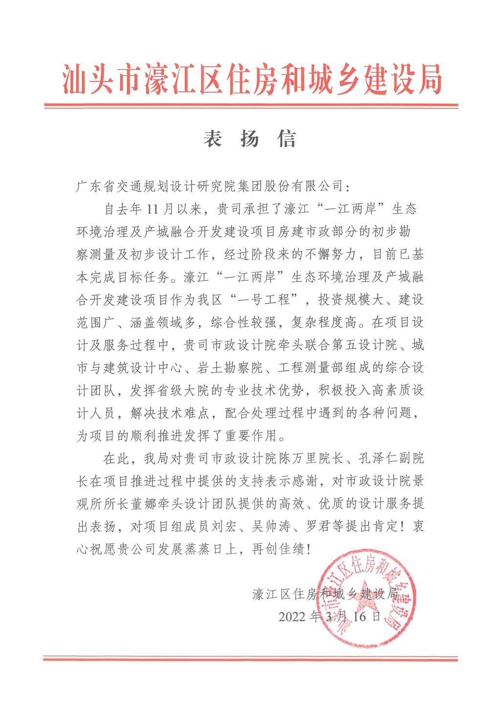 项目中标后,我集团积极投入高素质设计人员解决技术难点,主动承担项目推进过程中遇到的各种问题,以高标准的设计要求、高效率的设计响应,顺利完成了项目的初步设计工作。区委副书记、副区长黄鹏伟在初设汇报会议上,对我集团的工作表示了充分认可,对初设研究深度及设计成果给予了较高的评价。目前,本项目已顺利通过初步设计专家评审,初步设计修编成果也已完成提交。业主对我集团给予了书面表扬。