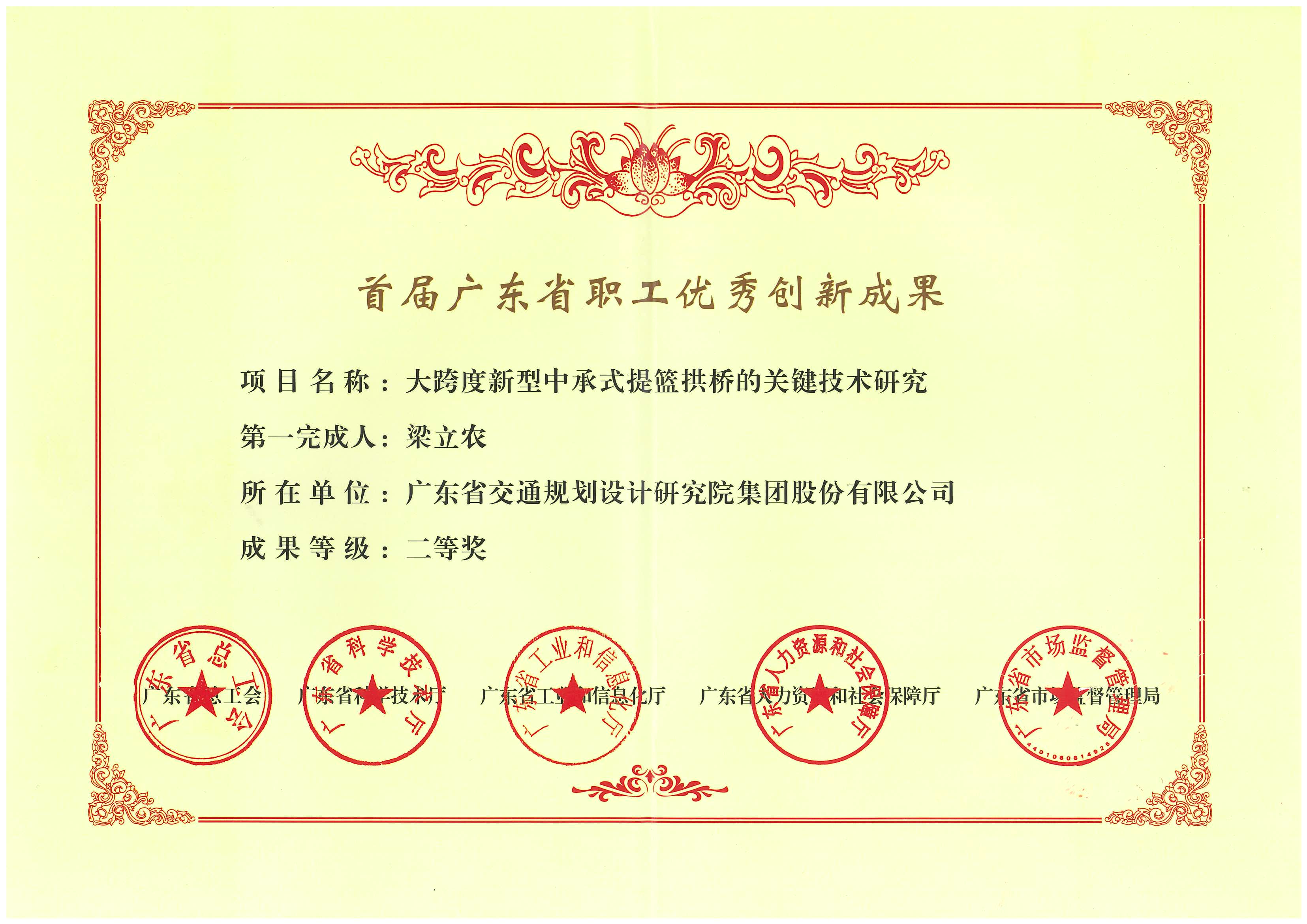 近日,公司梁立农创新工作室《大跨度新型中承式提篮拱桥的关键技术研究》项目获广东省职工优秀创新成果二等奖。