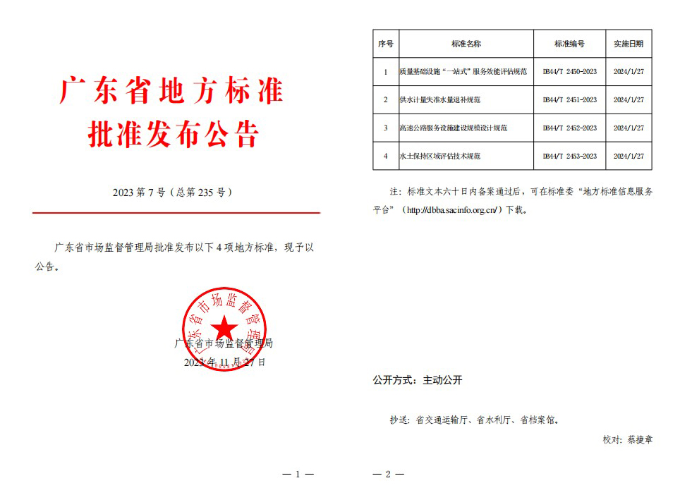 1127日,由公司主编的广东省地方标准《高速公路服务设施建设规模设计规范》(DB44/T 2452-2023)经广东省市场监督管理局批准正式发布,实施日期为2024127日。