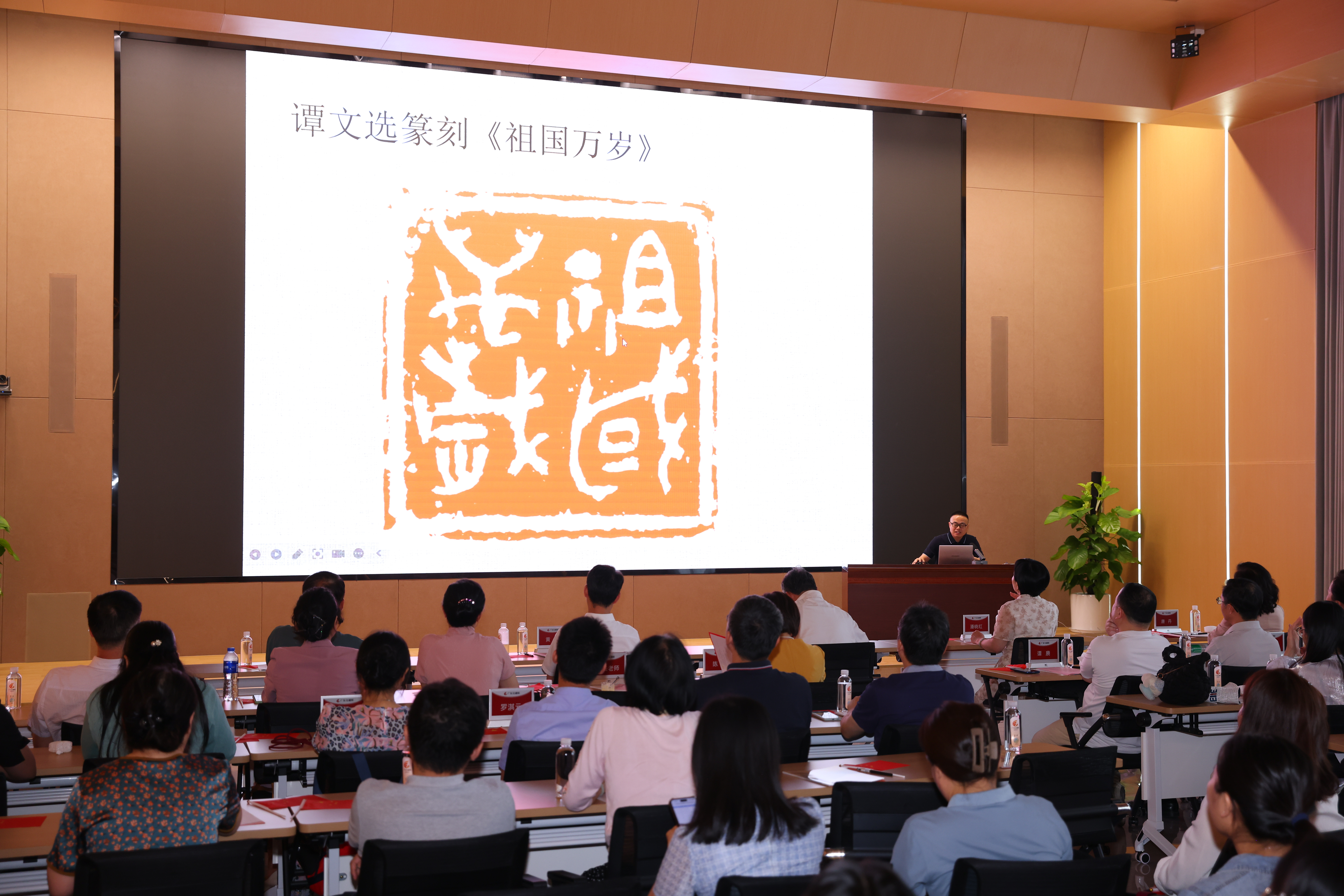 翰墨丹青颂经典,以文会友谱华章。广州美术学院谭文选老师以其深厚的艺术造诣和生动的讲解方式,为现场观众带来了一场别开生面的书法鉴赏授课,使大家从中领略了书法艺术的独特魅力。活动中还穿插了书法献礼环节,谭老师现场挥毫泼墨,创作了一幅寓意深远的书法作品,在祖国母亲75岁生日之际,向祖国献上最真挚的祝福,祝福祖国繁荣昌盛,祝福人民幸福安康。