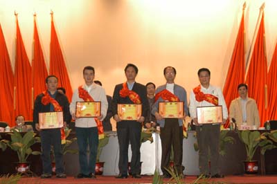 在欢快的音乐声中,获奖的先进集体代表和先进个人依次上台领奖,他们身披红绸带,喜气洋洋地接过奖牌和奖状。