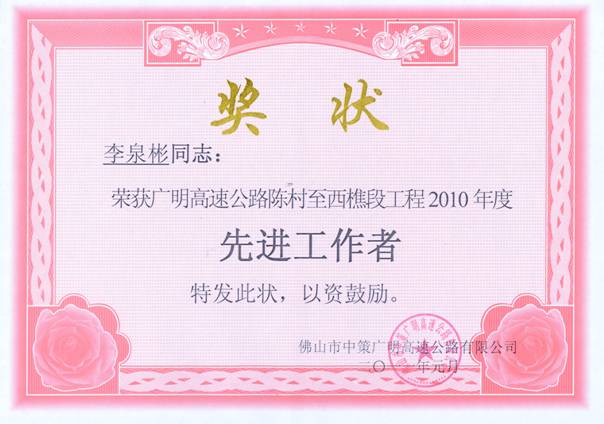 近日,第三路桥设计部设计代表李泉彬同志受到业主单位佛山市中策广明高速公路有限公司表彰,荣获广明高速陈村至西樵段工程2010年度“先进工作者”称号,为公司树立了良好的外部形象,赢得了荣誉,特表祝贺。