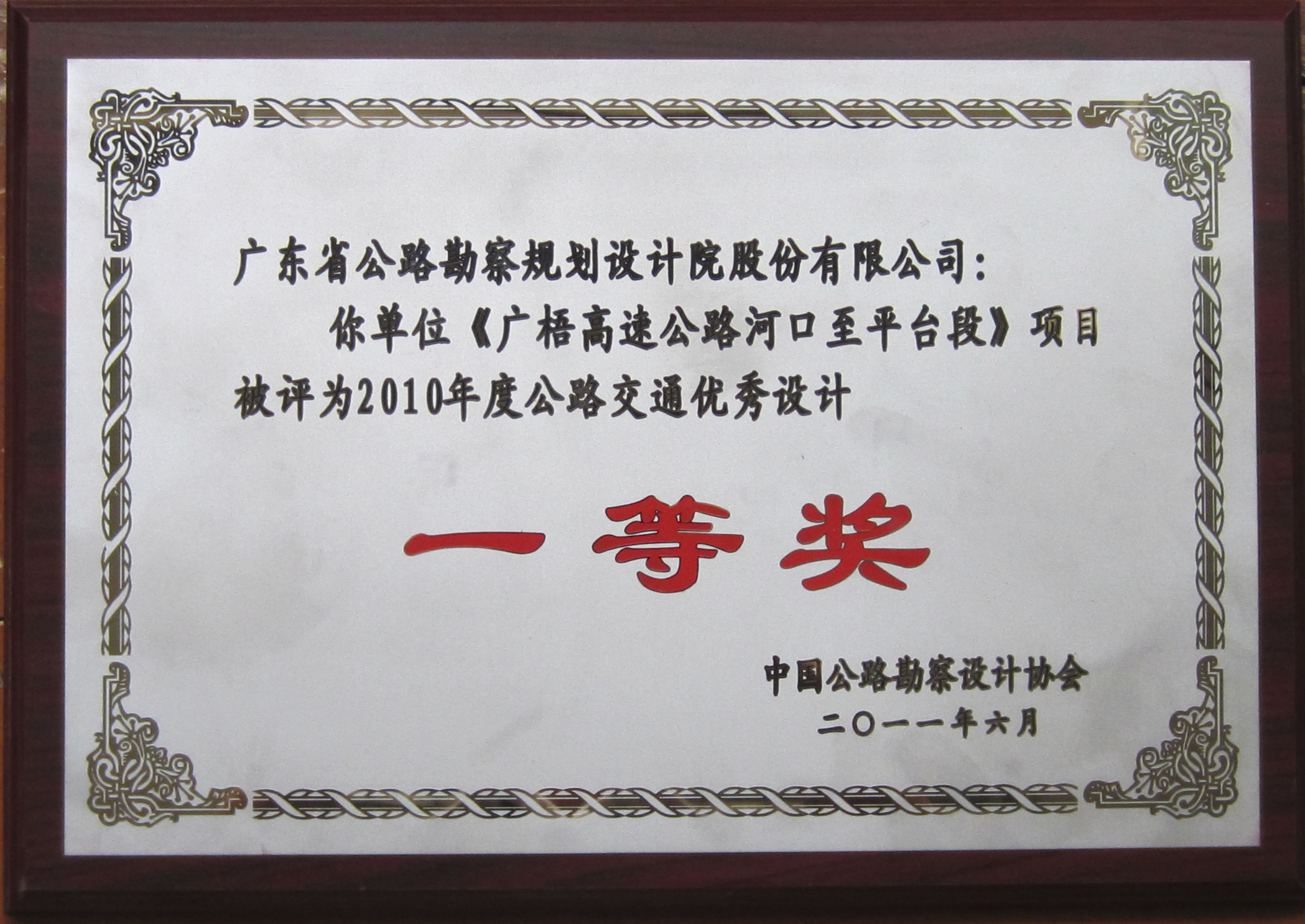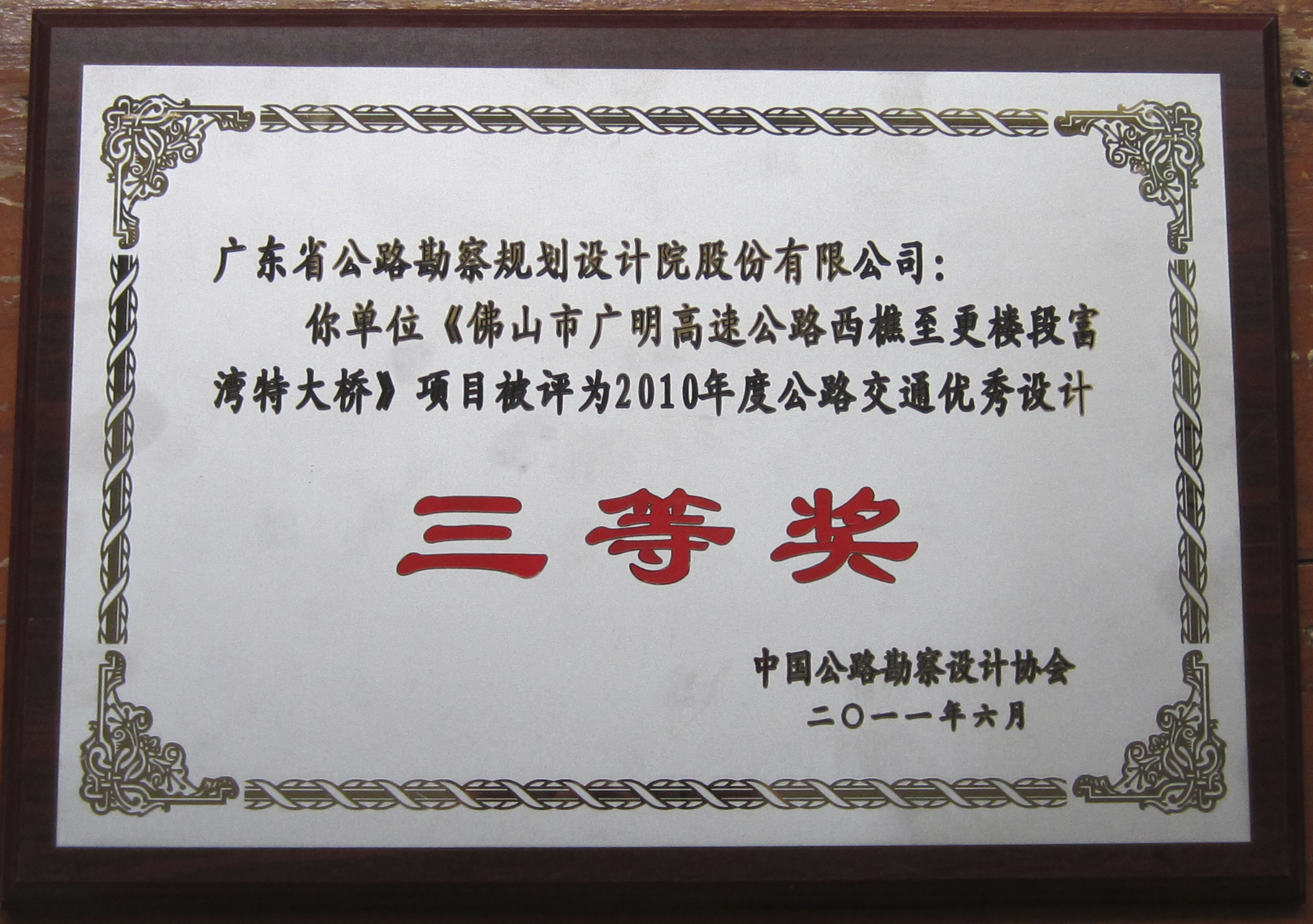 热烈祝贺: 公司五个项目分别荣获“2010年度公路交通优秀勘察设计奖” 一、2010年度公路交通优秀设计奖 一等奖:广梧高速公路河口至平台段 二等奖:广佛高速公路扩建工程交通工程 三等奖:佛山市广明高速公路西樵至更楼段富湾特大桥 二、2010年度公路交通优秀勘察奖 二等奖:广梧高速公路河口至平台段 三等奖:佛山市广明高速公路西樵至更楼段富湾特大桥