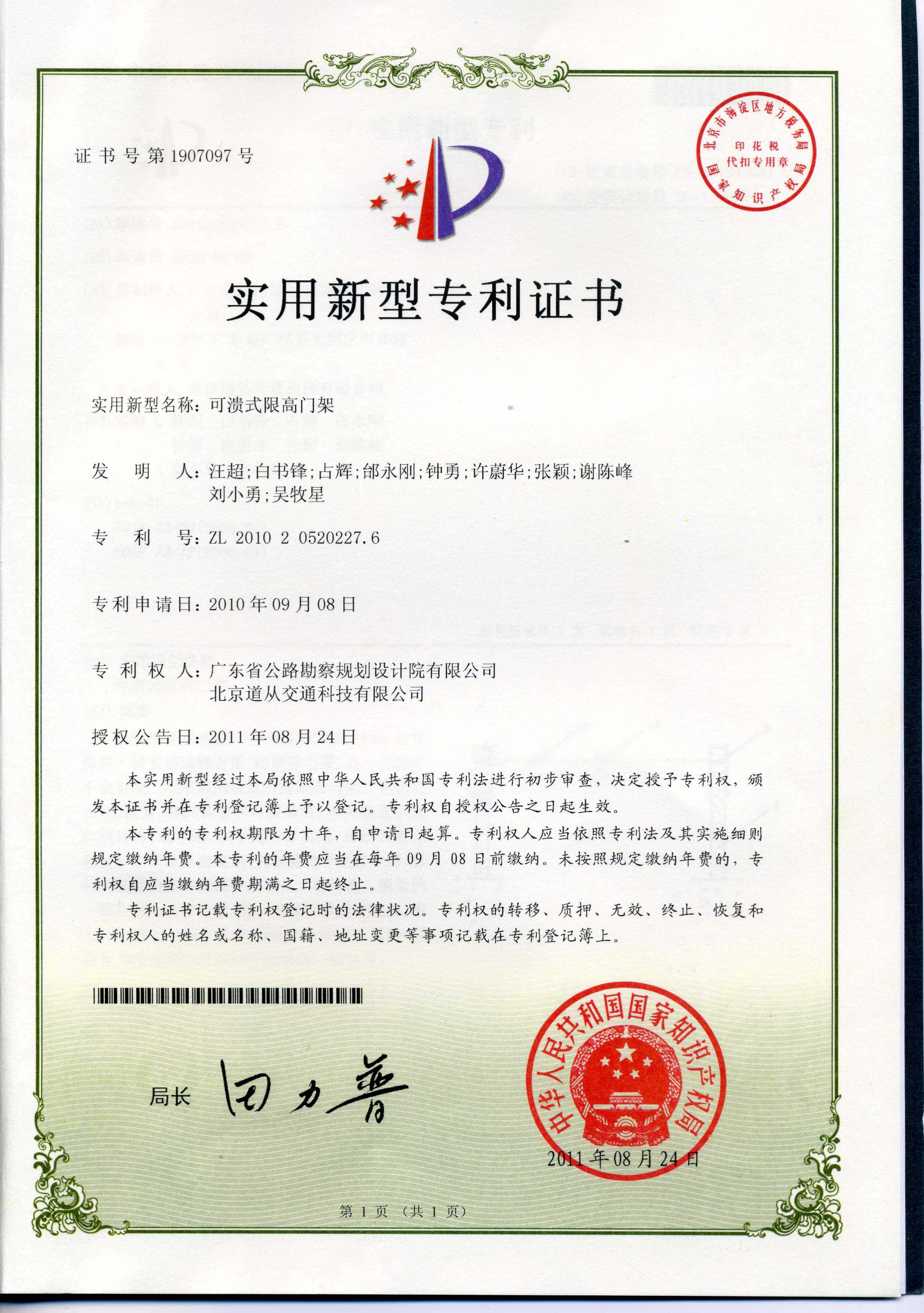 公司研发的“可溃式限高门架”,于2011年8月24日被中华人民共和国国家知识产权局授予实用新型专利权。
