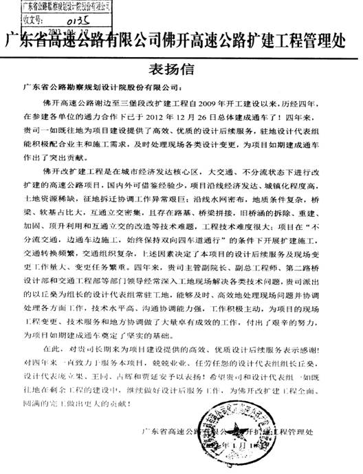 近日,佛开扩建工程管理处发来表扬信,高度肯定我司设计后服务,并对第二路桥分公司设计代表组丘燊组长、设计代表庞立果、王同、市政与交通工程设计部占辉、和立公司贾延安等人在佛开高速公路谢边至三堡段改扩建项目上的设计后服务表示满意和感谢。特表祝贺!