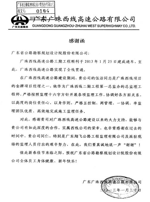 广珠西线高速公路三期工程1月25日顺利建成通车,广东广珠西线高速公路有限公司特发来感谢函,高度肯定我司监理服务工作,并对翔飞监理公司及该公司伍洁等派驻现场的监理人员给予通报表彰,特表祝贺。