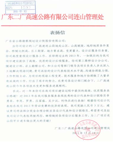 近日,广东二广高速公路有限公司连山管理处发来表扬信,对我司在二广高速连山段项目中提供的高效、优质服务表示赞扬,同时对负责该项目的第三路桥设计分公司等组织和个人给予了通报表扬。同期发来表扬信的还有大广高速连平至从化项目。特此报喜。