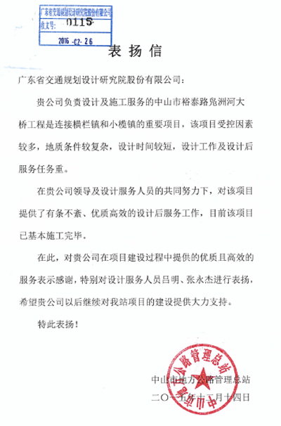 近日,中山市地方公路管理总站发来表扬信,对我司在中山市裕泰路凫洲河大桥工程中提供的高效、优质的设计后服务表示赞扬,同时该项目所属的第一路桥设计分公司及设计代表吕明、张永杰等个人给予了通报表扬。特此报喜。