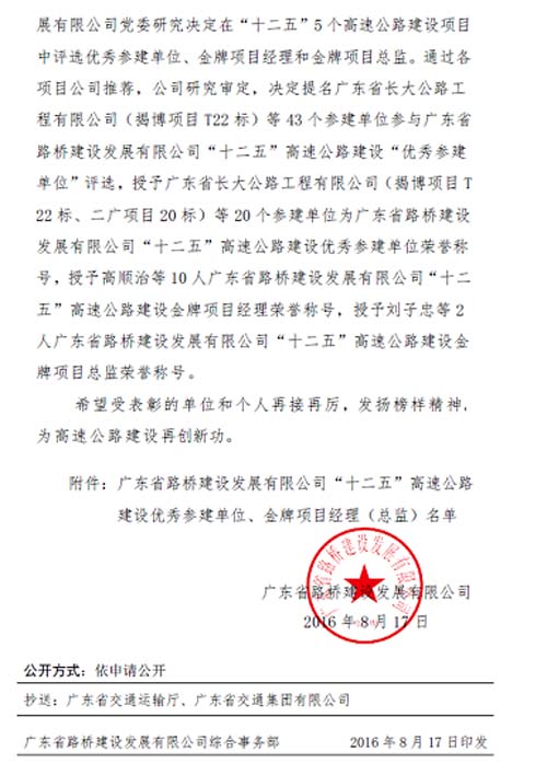近日,广东省路桥建设发展有限公司召开了“省路桥公司‘十二五’期间建设成就表彰大会”,我公司因第三分公司负责设计的揭博高速公路和二广高速公路表现突出,被授予“广东省路桥建设发展有限公司‘十二五’高速公路建设优秀参建单位”荣誉称号。 特此报喜。