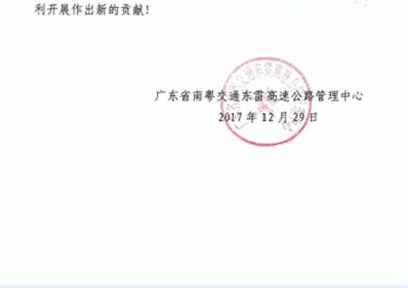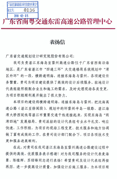 近日,广东省南粤交通东雷高速公路管理中心发来表扬信,对我司在湛江东海岛至雷州高速公路项目中提供优质、高效的设计后服务表示肯定,对负责该项目的设计代表麦海景、陈植辉、苏绍锋给予了通报表扬,特此报喜!