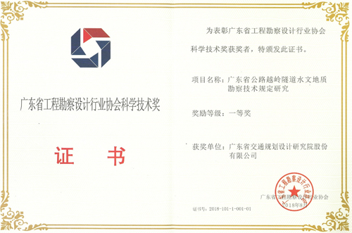 《广东省公路越岭隧道水文地质勘察技术规定研究》荣获一等奖,获奖人员:李水清、李红中、张修杰、王军、王强、邓超文、李树茂、张金平、林少忠、刘祥兴;
